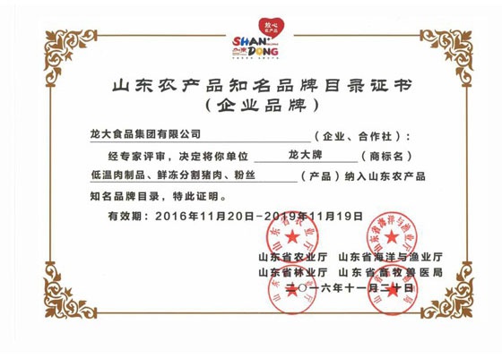 11月20日,山东省农业厅、海洋与渔业厅、林业厅、畜牧兽医局联合公布了《山东省首批知名农产品区域公用品牌和企业产品品牌名单》,z6尊龙凯时app官方网站生产的尊龙牌低温肉制品、尊龙牌鲜冻分割猪肉和尊龙牌粉丝三个产品入选《山东省首批知名农产品企业品牌目录》。